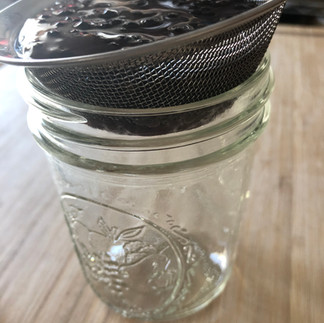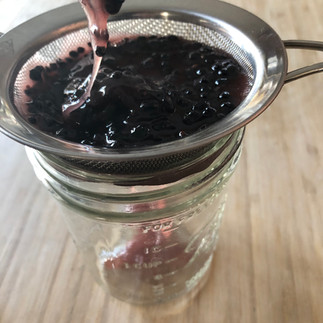 To strain the elderberries once infused, you can soften the honey by using the double broiler method again. Set out another clean jar, and gently pour half of the infusion out, gently pressing down on the berries to strain all the honey, (this can take some time).